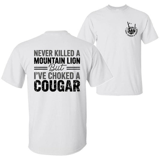 Never Killed a Mountain Lion But I have Choked a Cougar Funny Quote T-Shirt, Sarcastic Humor 2 Sided Graphic Design Unisex Cotton T-shirt for for Women Womenswear Top